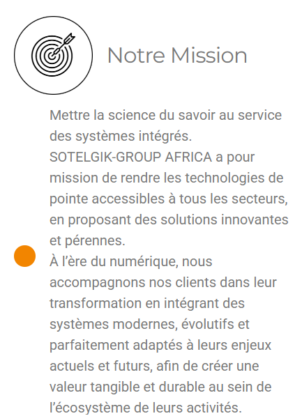 Portée par une forte culture d’innovation et d’excellence, SOTELGIK-GROUP AFRICA conçoit et déploie des solutions technologiques à forte valeur ajoutée, répondant aux enjeux actuels et futurs des organisations. L’entreprise accompagne les entreprises de toutes tailles, les ONG, les ambassades ainsi que les particuliers dans la modernisation, l’optimisation et la sécurisation de leurs infrastructures.